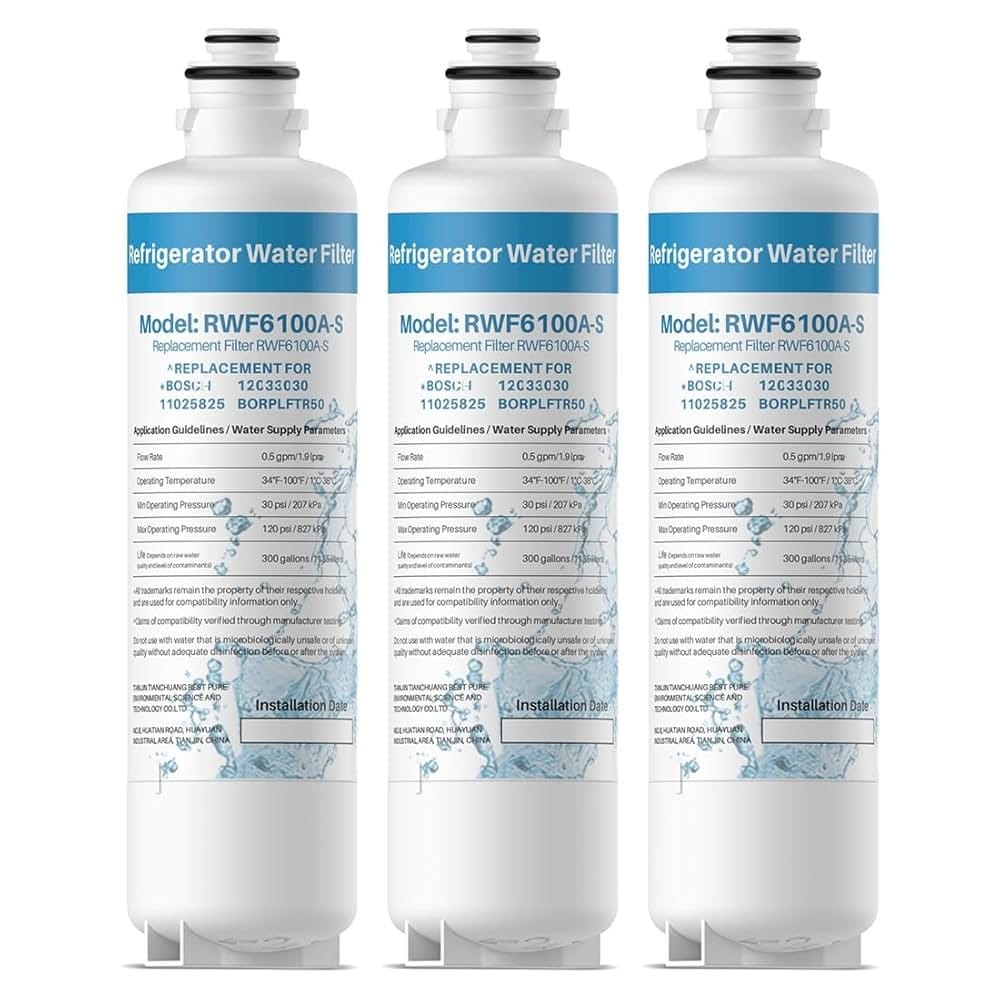 The Spring Source SS-RWF6100A-S (also referenced in marketplace listings as RWF6100A / BORPLFTR50 family) is a replacement refrigerator water filter compatible with many Bosch, Thermador and Gaggenau refrigerators. It uses a dense activated carbon block to reduce chlorine taste & odor and a wide range of contaminants while improving water and ice clarity. Vendor specs list a service life near 6 months and a rated capacity typically reported between ~250–300 gallons (use dependent).